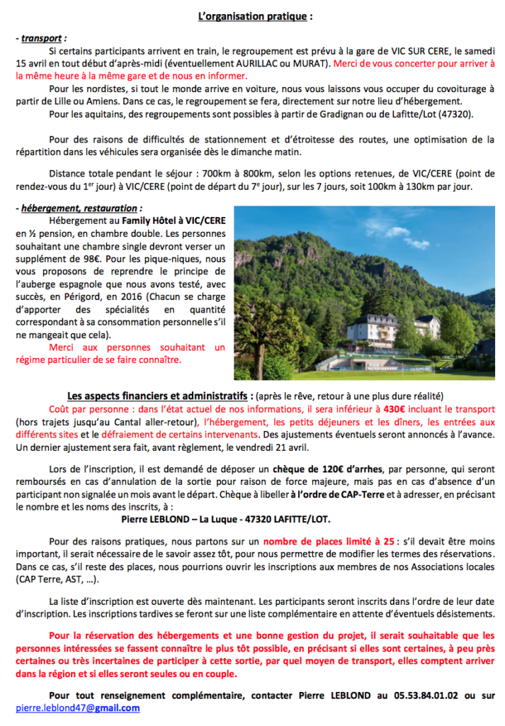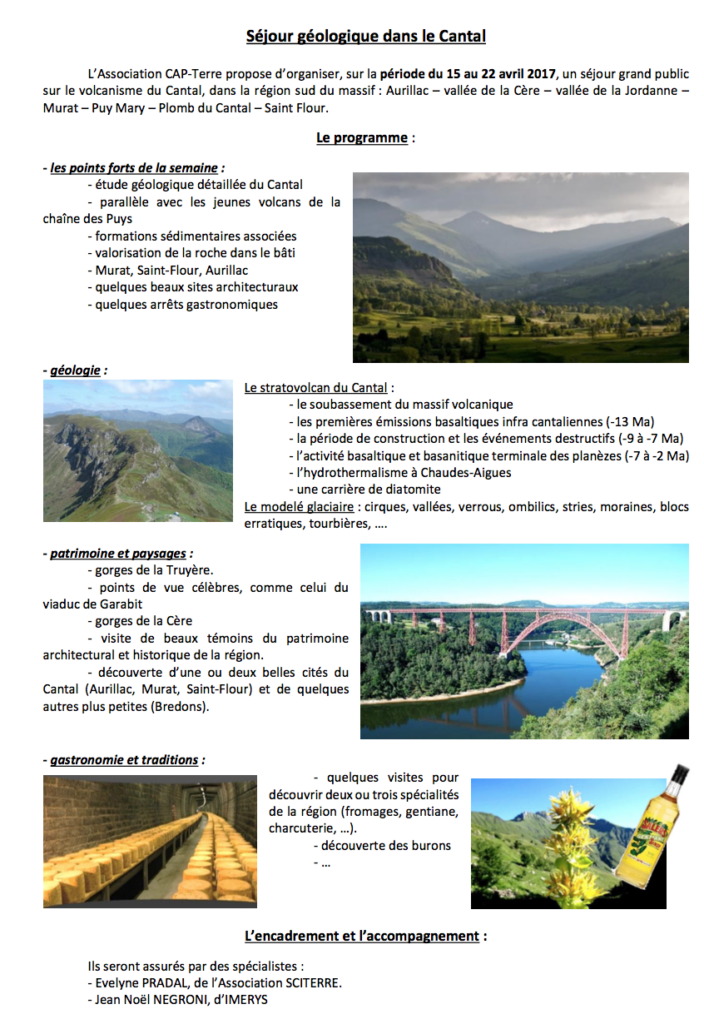 Comme tous les ans, depuis plusieurs années, CAP Terre dont la régionale APBG de Bordeaux fait partie, organise un séjour auquel les régionales APBG de Lille et Amiens participent. Cette année, le séjour a pour cadre le Cantal du 15 au 22 Avril. Les professeurs de la régionale de Bordeaux y sont naturellement conviés et la présence de quelques uns d’entre eux sera très appréciée.